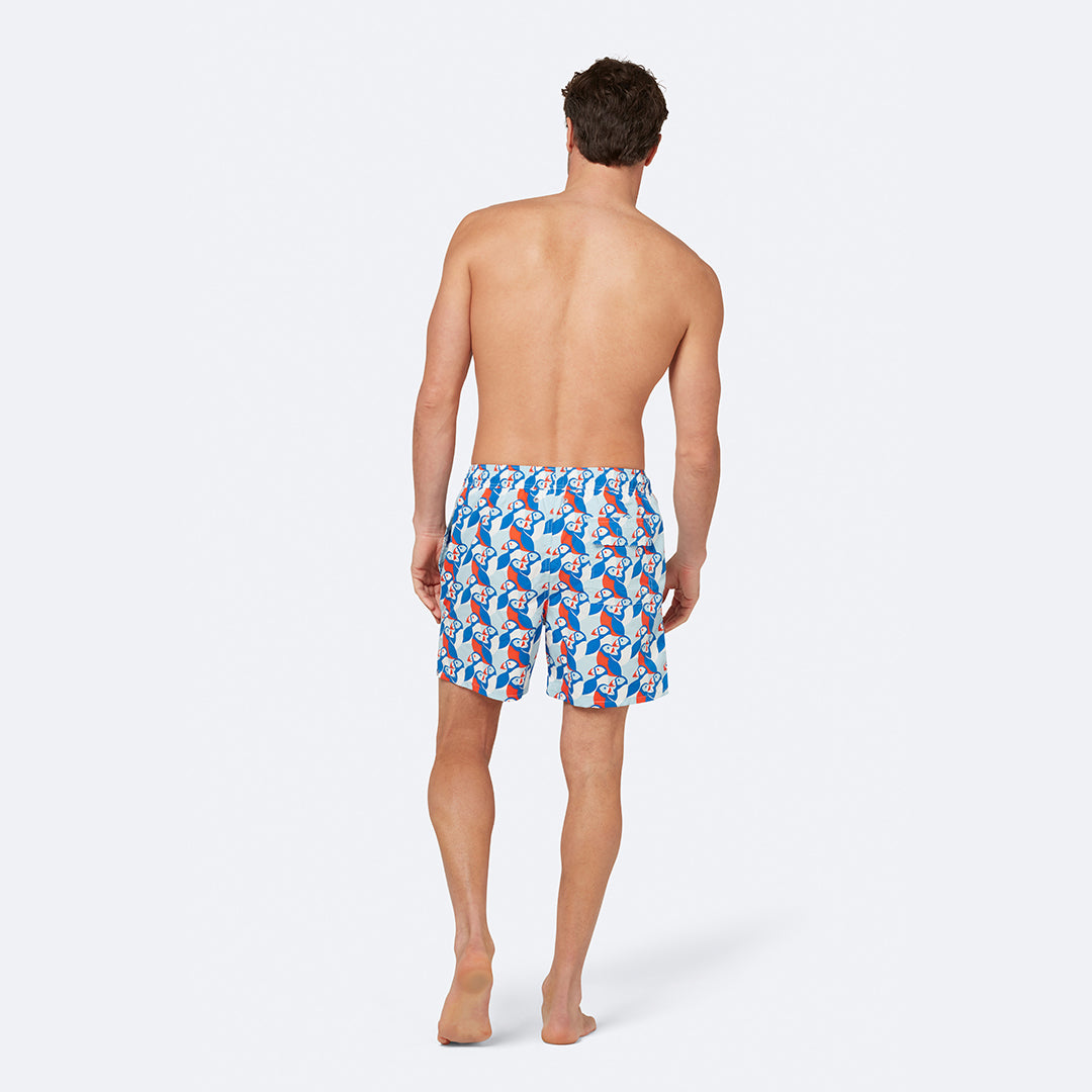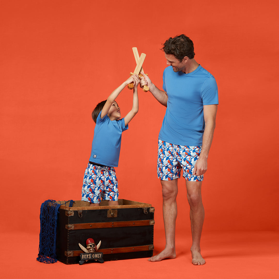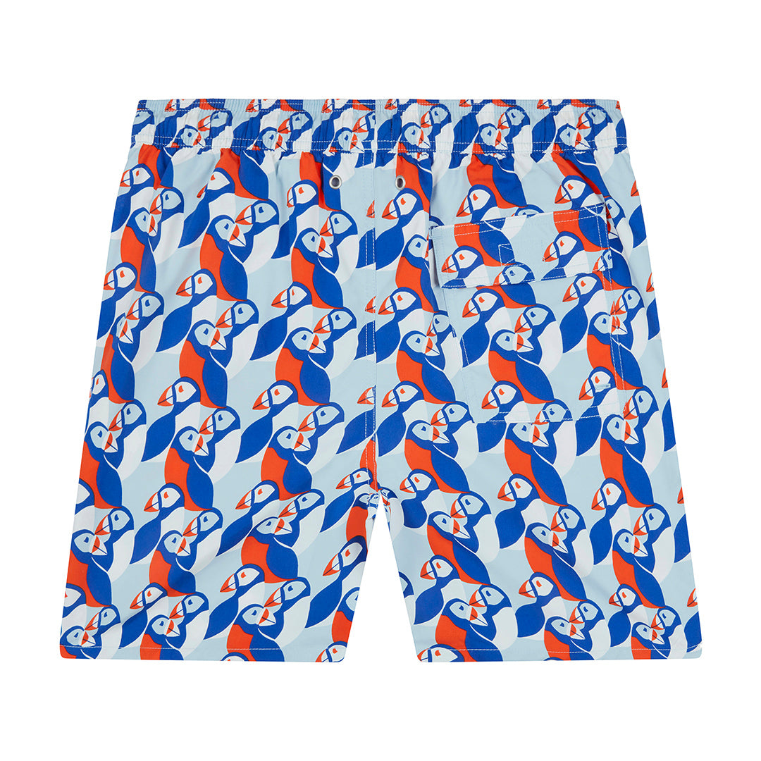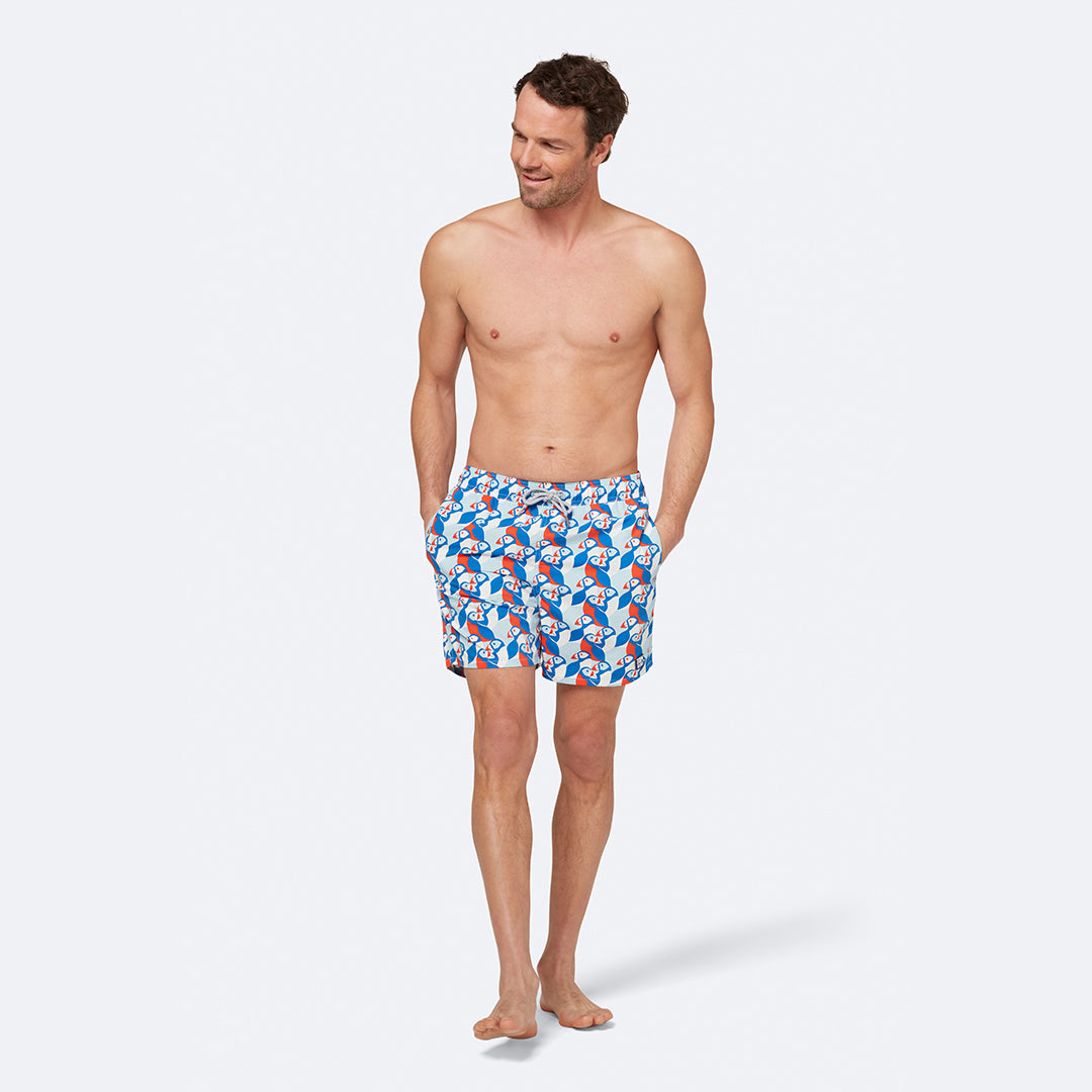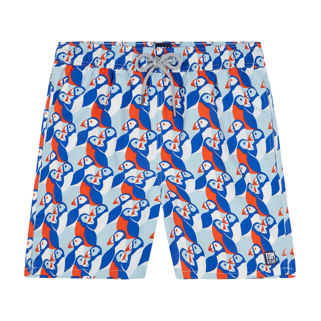 The perfect puffin print adorns these bold and bright swimmers. A distinctly Tom & Teddy design, inspired by nature on the idyllic Cornish coastline, these trunks are just what Dad and his little guy need for splashes at the pool and dives under the waves.