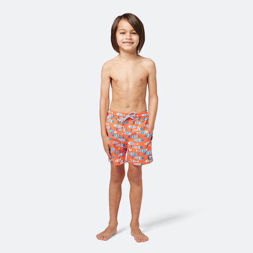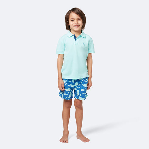 Our new fish print in the most flattering of mid-blue and soft green shades. Wear these to the beach with a white t-shirt or navy polo for a fresh summertime look. Available in matching pairs for men and boys.