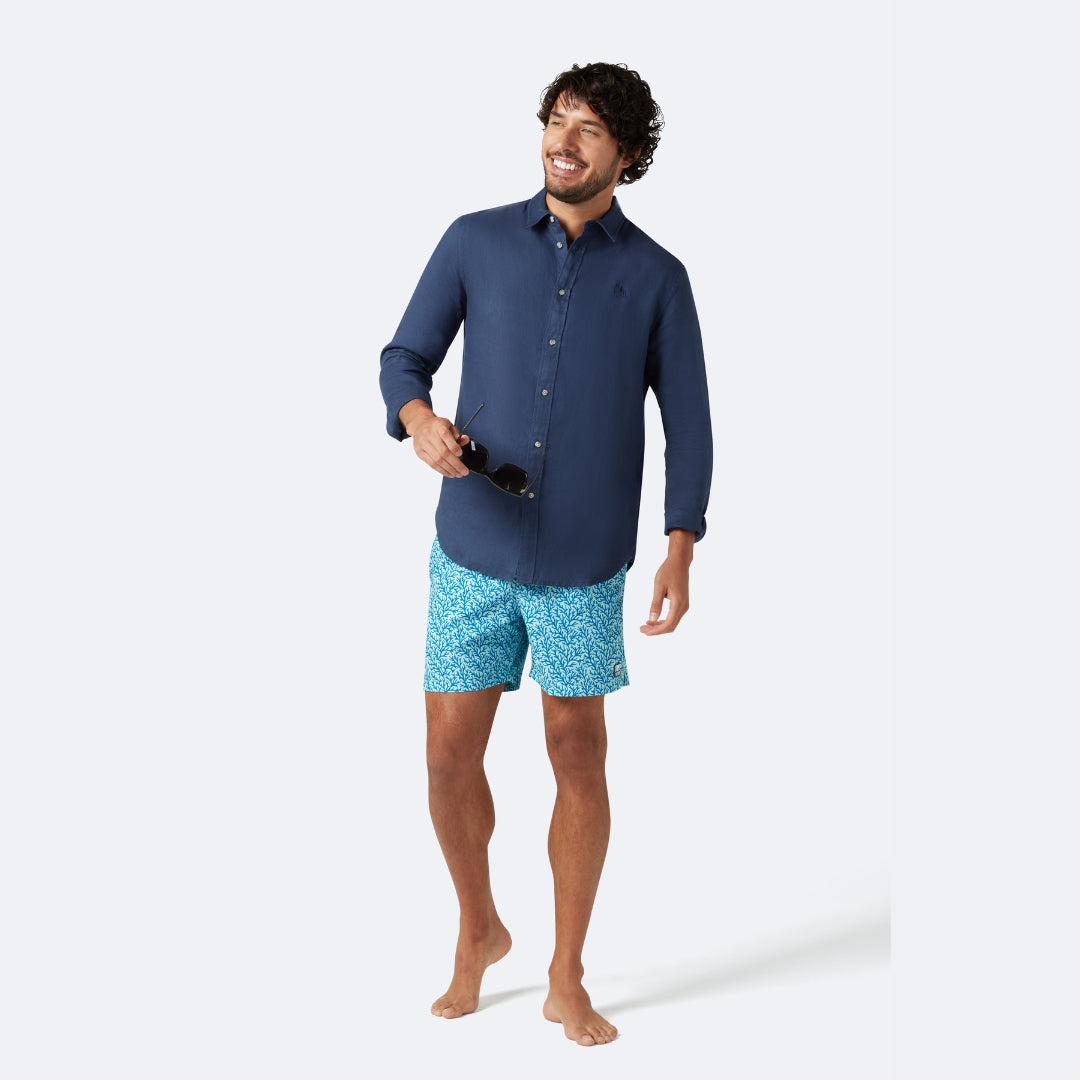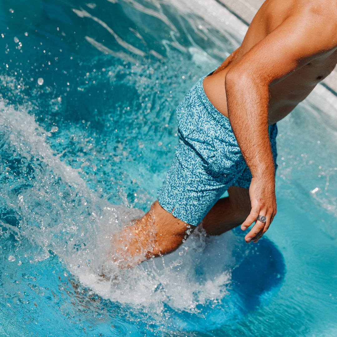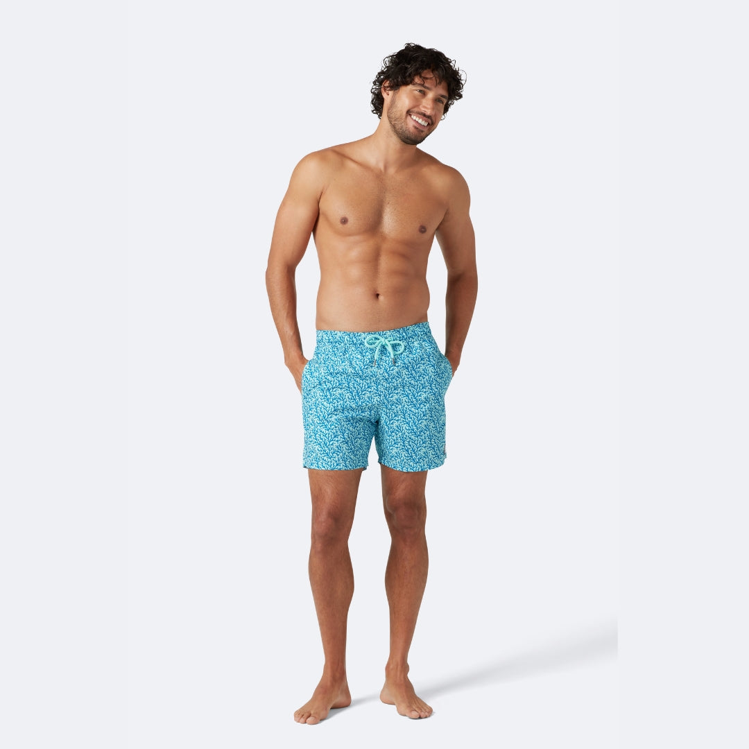 Our Aqua & Blue Coral men’s swim shorts are a fresh colourway of our popular coral print, featuring a detailed coral motif across calming aqua and ocean-blue tones. Designed for days that flow from swimming and poolside fun to lunch or exploring the beach, these shorts strike the perfect balance between smart and functional holiday wear.