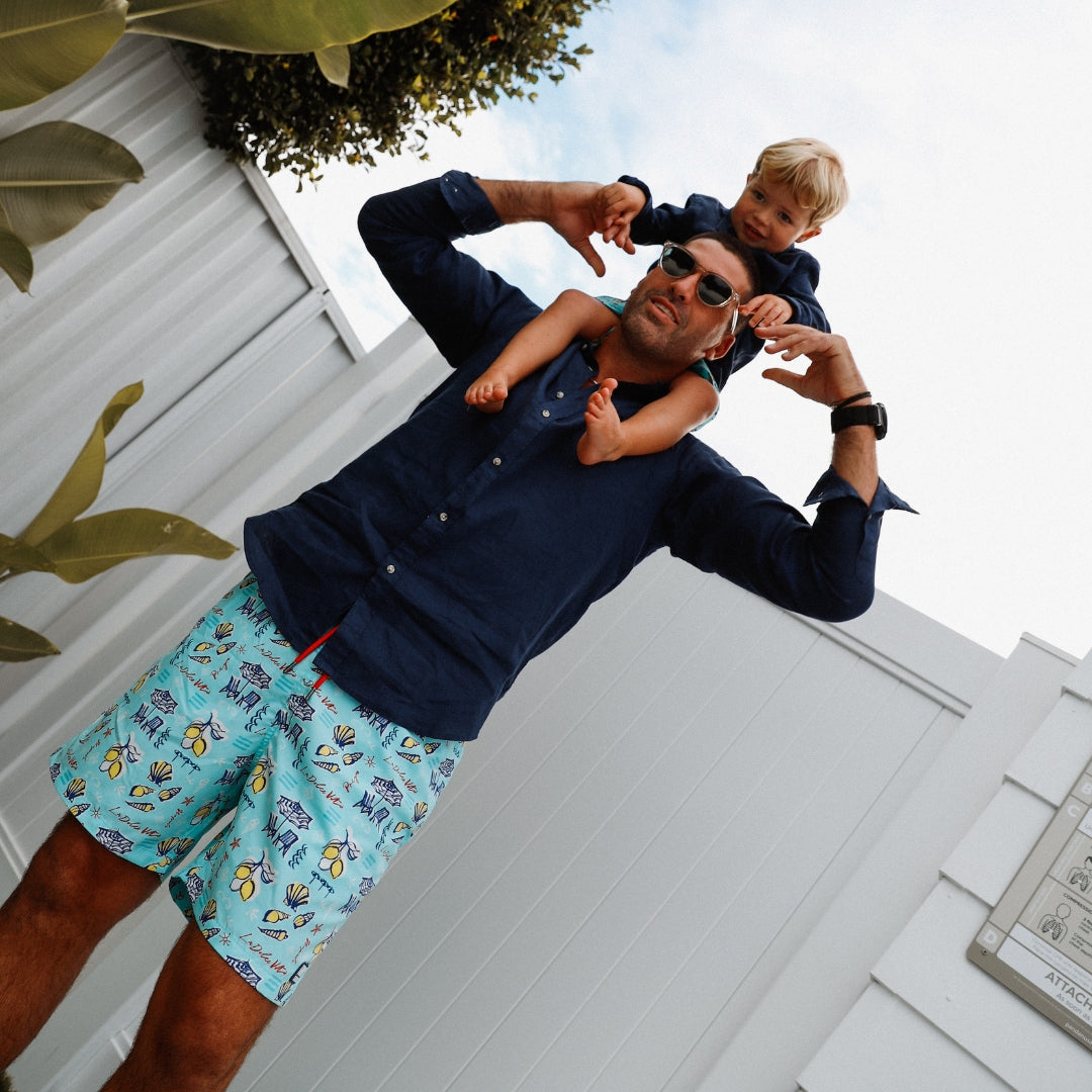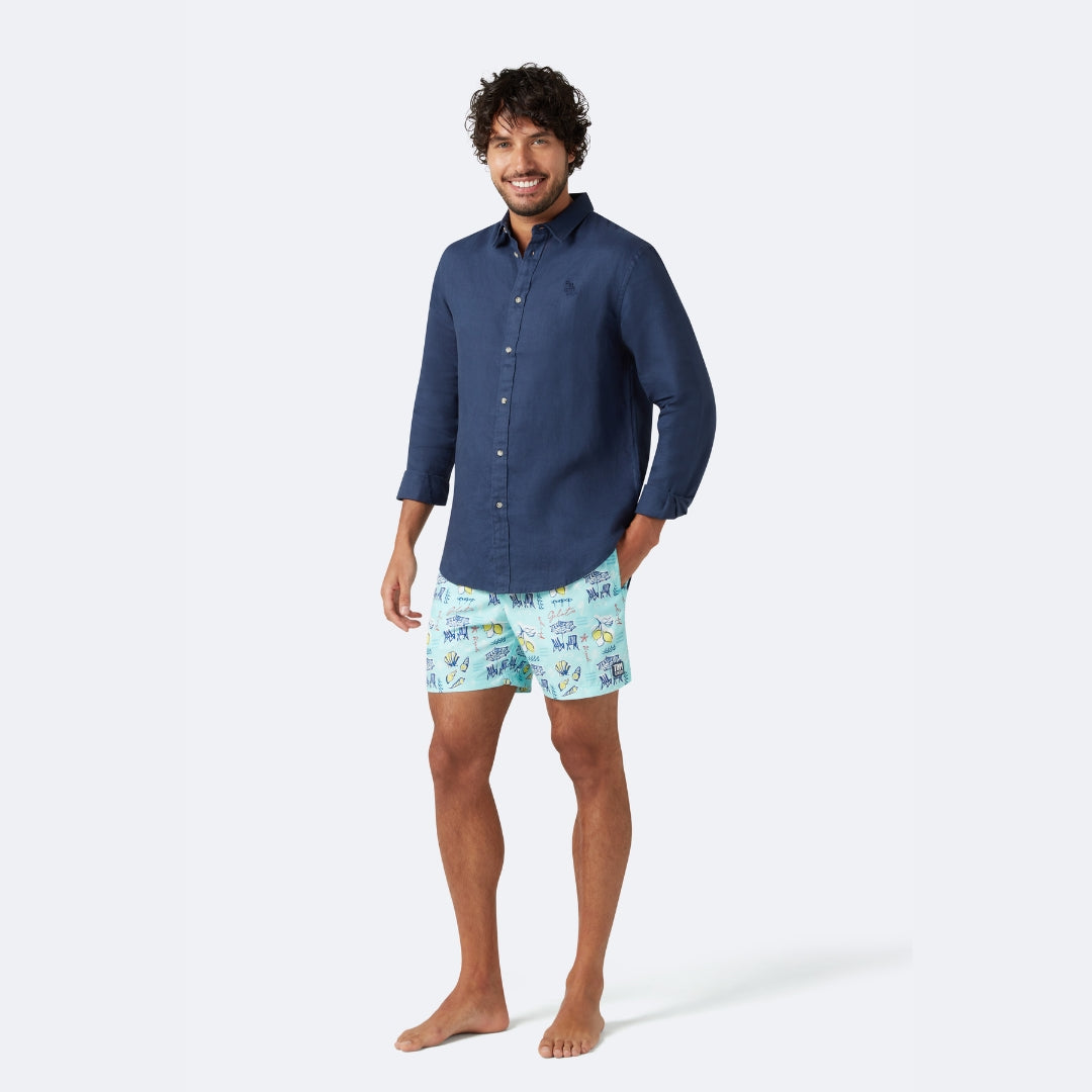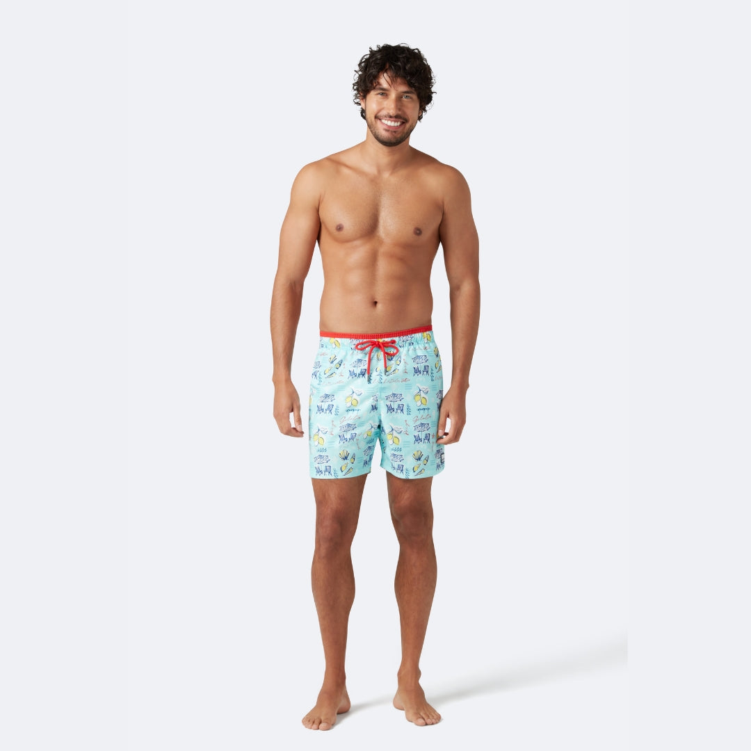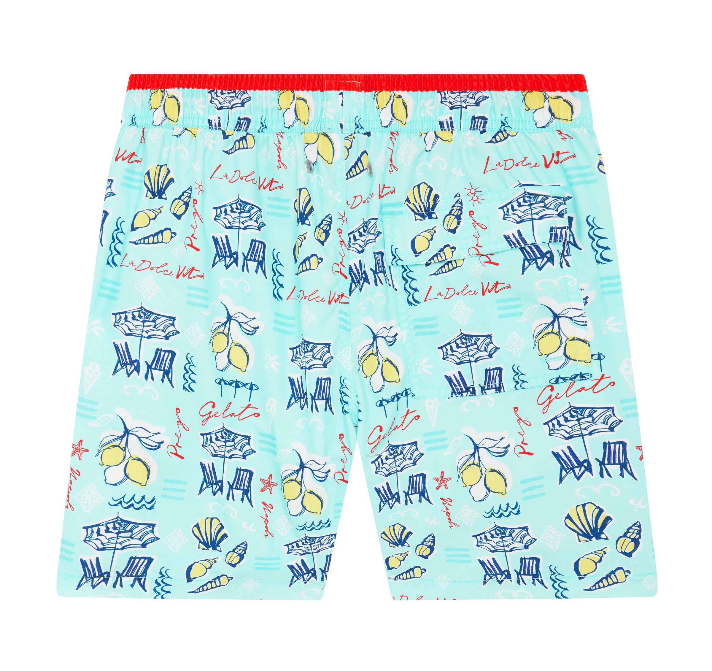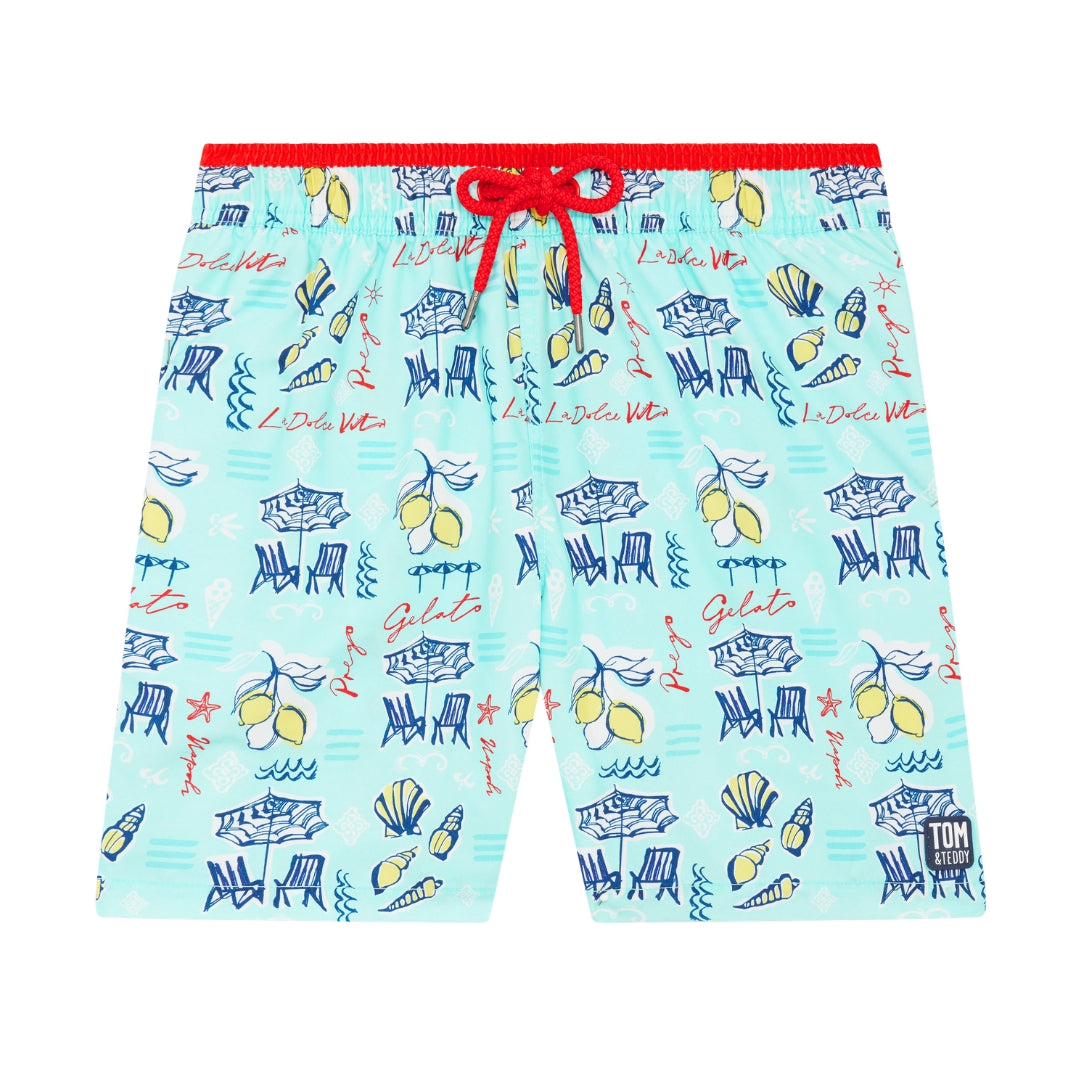 Our Aqua & Lemon Italia men’s swim shorts capture the spirit of relaxed Italian holidays. Set on a soft aqua blue base, the print features bright yellow lemons, seaside shells and classic Italian beach umbrellas, finished with bold red La Dolce Vita lettering.