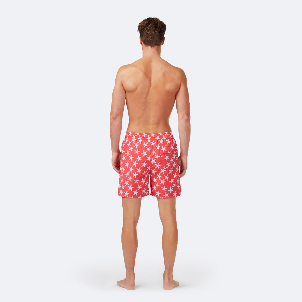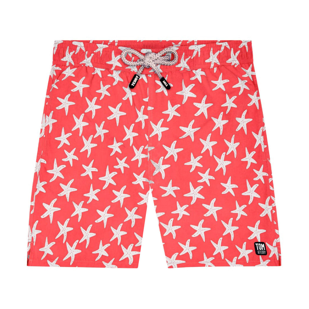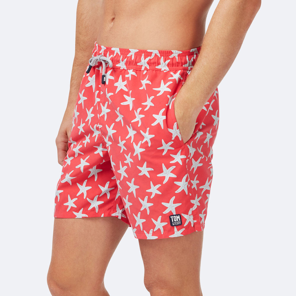 Classic-style Tom & Teddies with an elasticated waist, these warm pink and blue swim shorts feature bold Starfish print.